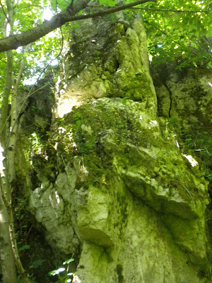 Az út, amelyre visszatértünk, nagyon szép volt: meredek hegyoldalak között vezetett a völgyben, viszonylag vízszintesen, hurrá. Kisvártatva azonban társaim nem bírták elviselni, h. jelentősebb szintkülönbség nélkül, mintegy vízszintesen haladunk. Fenn a hegyoldalban valamiféle sziklák látszottak. Igaz ugyan, h. csaknem függőlegesen kellett felmenni hozzájuk, de már hogy is jelentene ez nekünk akadályt? A függőlegesen lefelé történő közlekedésben való jártasságomat hitelesen bemutattam múlt szombaton, most eljött az idő a függőleges felfelére is. Voltak helyek, ahol hosszú ideig csak álltam, és néztem, h. innen hogyan is lehetne továbbmenni… sőt, M. Sz. szerint kétszer is ingerült megjegyzéseket tettem. Ez is igazolja türelmemet és önfegyelmemet, ugyanis szívem szerint folyamatos, hangos zokogással követeltem volna az alvósmacimat. Voltak pillanatok, amikor arra gondoltam, h. visszafordulok, de lenézve magam mögé meg kellett állapítanom, h. felmenni ugyan halálosan veszélyes, de lemenni még annál is halálosabban veszélyes. Tehát mentem tovább felfelé, sziklákon csúszva meg, ágakba kapaszkodva, összeszedve jó néhány karmolást, és titokban nagyon élvezve az egészet. Igen, még a riadt pillanatokban is. A teljesítménytúrák nem mennek ilyen helyekre. Mondjuk valószínűleg azért, mert a rendezők vágynak arra, h. a mezőnynek legalább EGY RÉSZE élve beérjen a célba. Mit is kezdenének különben azzal a rengeteg kitűzővel meg oklevéllel?